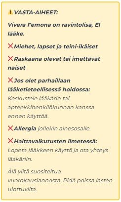 Vivera Femona on valmistettu eurooppalaisten määräysten sallimista ainesosista, ja se on yleensä hyvin siedetty. Yksilöllisiä herkkyyksiä voi kuitenkin esiintyä.