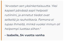 Säännöllisesti käytettynä ja osana tasapainoista elämäntapaa Femona voi tukea hyvinvointiasi vaihdevuosien aikana. Tulokset vaihtelevat henkilöstä toiseen.