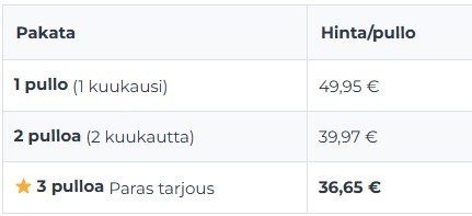 3 pullon pakkaus sopii parhaiten 2–3 kuukauden kuuriin ja tarjoaa parhaan vastineen rahalle 60 päivän takuulla!